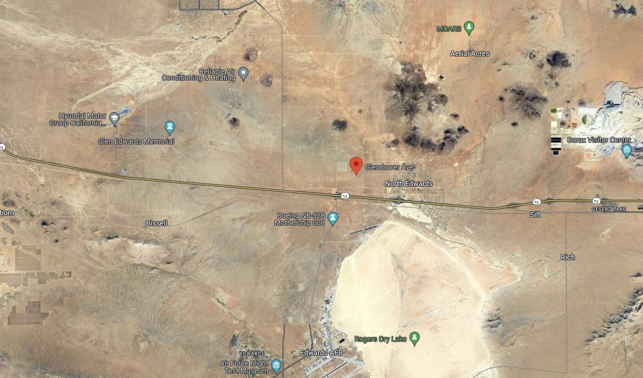 Over half an acre lot in North Edwards, Southern California. North Edwards is a small community in Kern County, California, located near Edwards Air Force Base, about 7 miles north of the base’s main gate and roughly 15 miles northeast of Mojave. It has a population generally under 1,000 residents, with many people associated with the nearby air force base. The community consists of a mix of family households and individual residents.